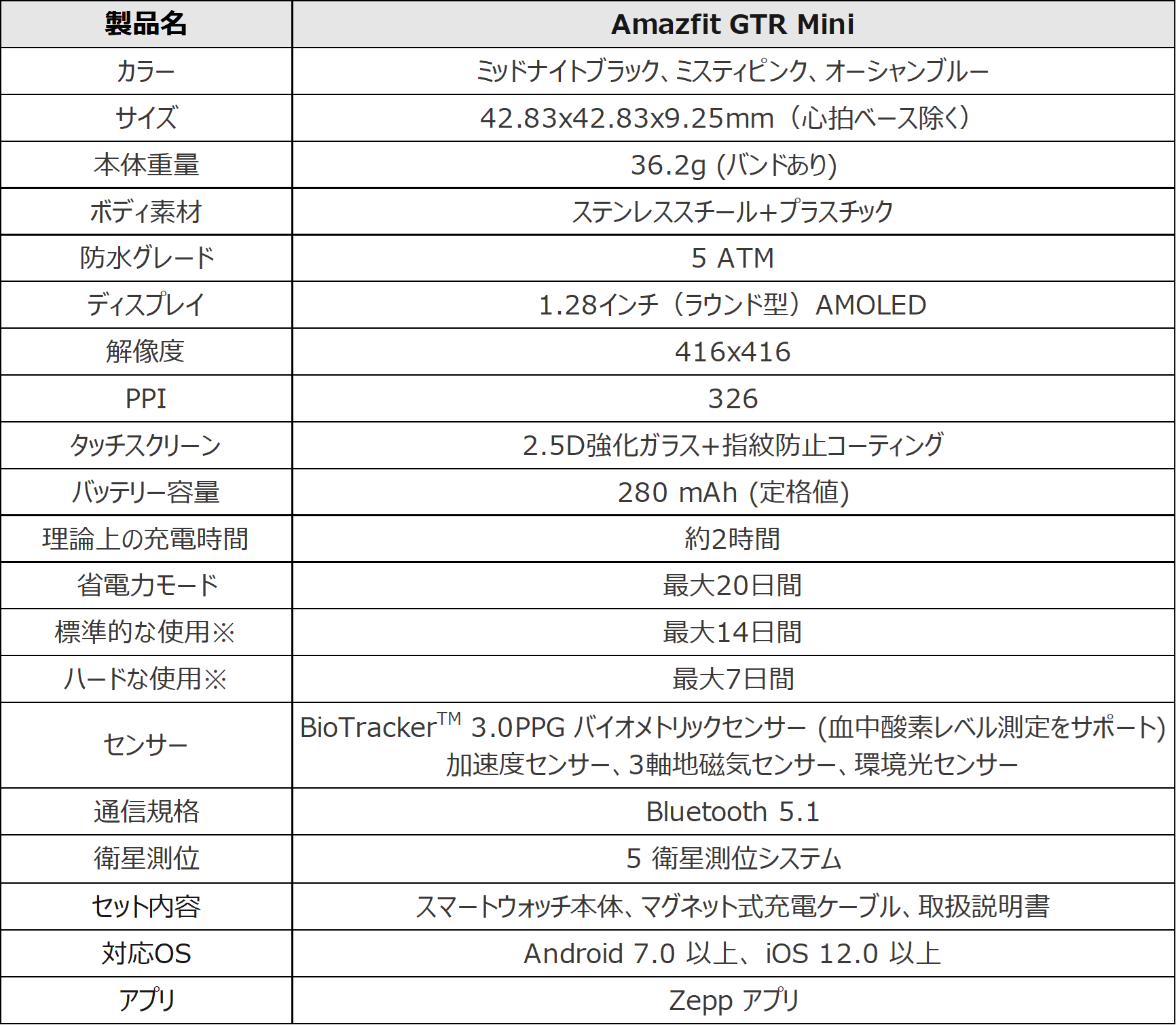 - 製品名:Amazfit GTR Mini(日本語読み:アマズフィット ジーティーアール ミニ)