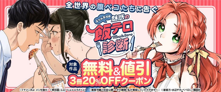 さらに、無料や値引き作品が100作品以上!!グルメマンガを対象にしたシーモア限定施策「よだれ不可避 魅惑の飯テロ診断」3冊20%OFFクーポンキャンペーンも実施します。