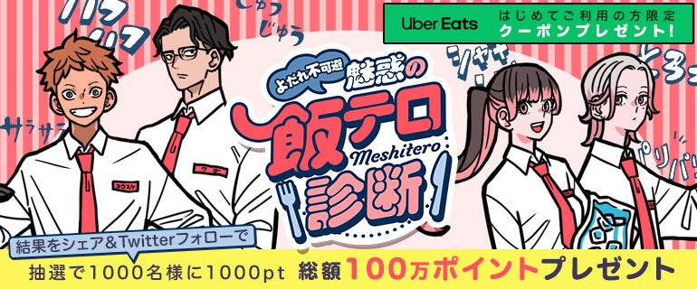 Uber Eats を初めてご利用の方には、キャンペーン期間中、1 回のご注文金額の合計(少額注文における手数料、サービス料・サービス利用料、配達手数料を除く)が 2,400 円以上の場合、1,800 円割引になるプロモーションコードをプレゼントいたします。プロモーションコードは、「よだれ不可避 飯テロ診断」へご参加いただいた後に表示されます。