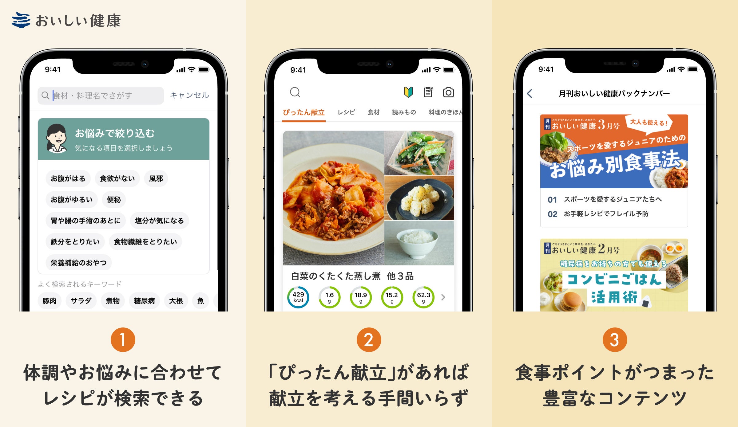 パーソナライズ献立提案・栄養管理支援アプリ『おいしい健康』は、健康な方やダイエット、生活習慣病予備群といった「予防・自己実現のための食事」から、患者や妊婦・高齢者など「医療上の制限がある方の食事」まで、エビデンスに基づく食事管理を、毎日の家庭でおいしく手軽に実践できるよう、サポートいたします。『おいしい健康』では、難しい食事管理をどなたでも簡単に行えるように、一般的なレシピアプリのような使い勝手で実現。個々のユーザーに適した栄養バランスに加え、冷蔵庫の食材や好きな食べもの、料理の腕前や調理時間に合わせた献立を提案する「究極の食のパーソナライズ」を実現し、予防や疾患治療の支援、ひいては「食とデータによる医療費抑制とQOL向上の両立」という社会課題解決を目指します。