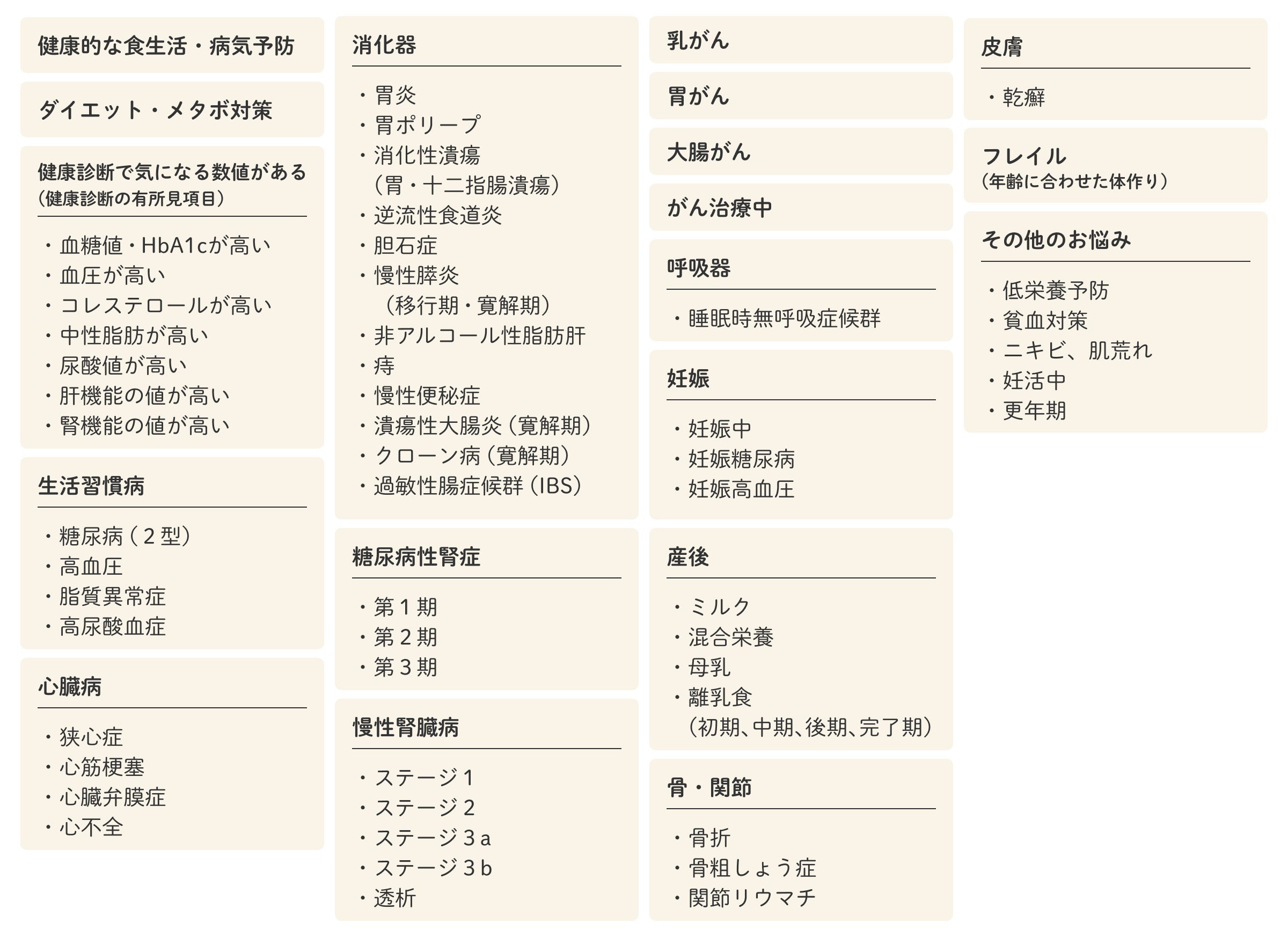 今回はフレイル(年齢に合わせた体作り)の他にも、糖尿病性腎症(第1〜3期)、慢性腎臓病(CKD)ステージ3b、乳がん(抗がん剤治療中、ホルモン療法中、放射線治療中、治療を終えた方・経過観察中の方など)の3つの病態をリリース・リニューアルいたします。