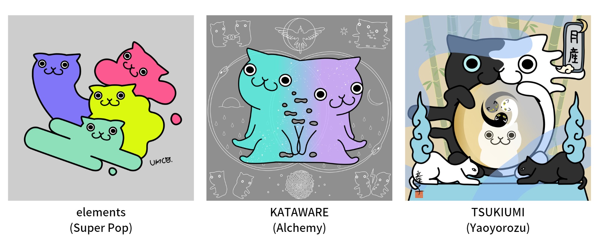 LLACのリードデザイナーである猫森うむ子氏は3月21日(火)に自身初のフリーミント(※)企画を開催。「Super Pop」「Alchemy」「Yaoyorozu」の3つのコレクションで各1,111点ずつ、計3,333点のNFTを発行しました。
