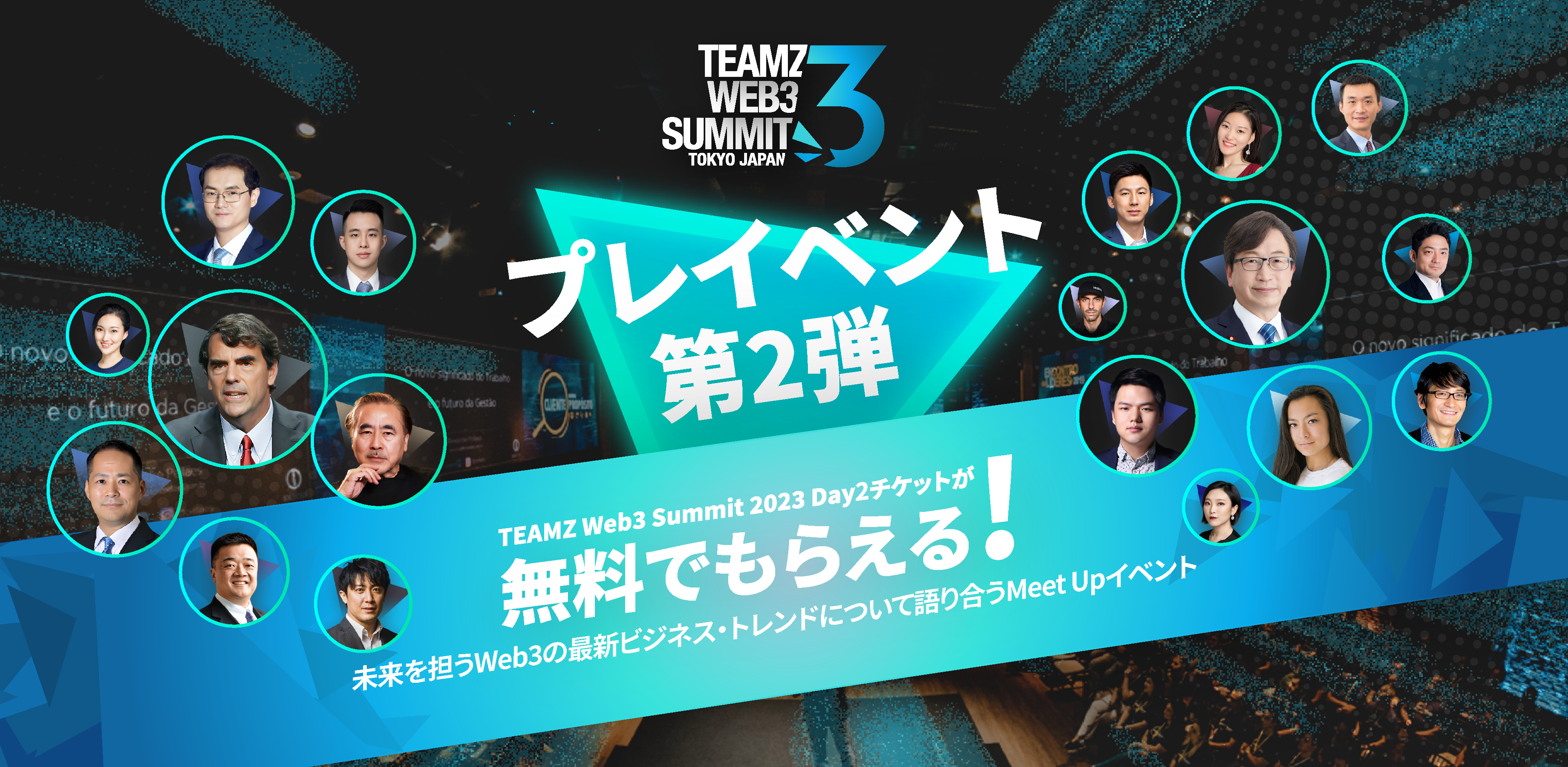 2023年3月30日(木)六本木にて、18:30からTEAMZ Web3 Summitのプレイベントを行います。今回、プレイベント第2段と題して、参加者に抽選でWeb3 SummitのDay2 チケット(¥15,000相当)をプレゼントします!本プレイベントでは、Web3の最新ビジネス・トレンドについて語り合うMeet Upイベント・交流会を行います。