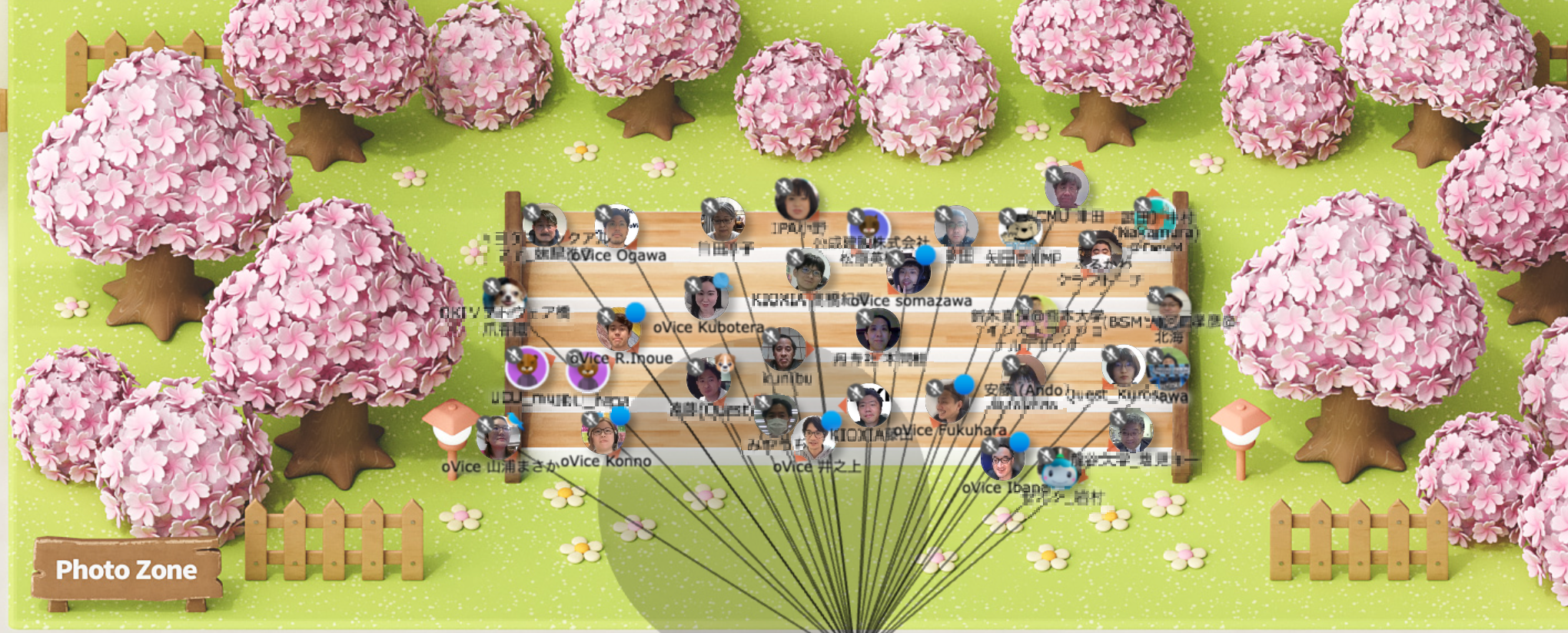 ▲お花見用レイアウトで記念撮影を行った様子(※大人数で「ライブアバター(β版)」を使用して記念撮影を行う場合は、ミーティングオブジェクトにつながる必要があります)