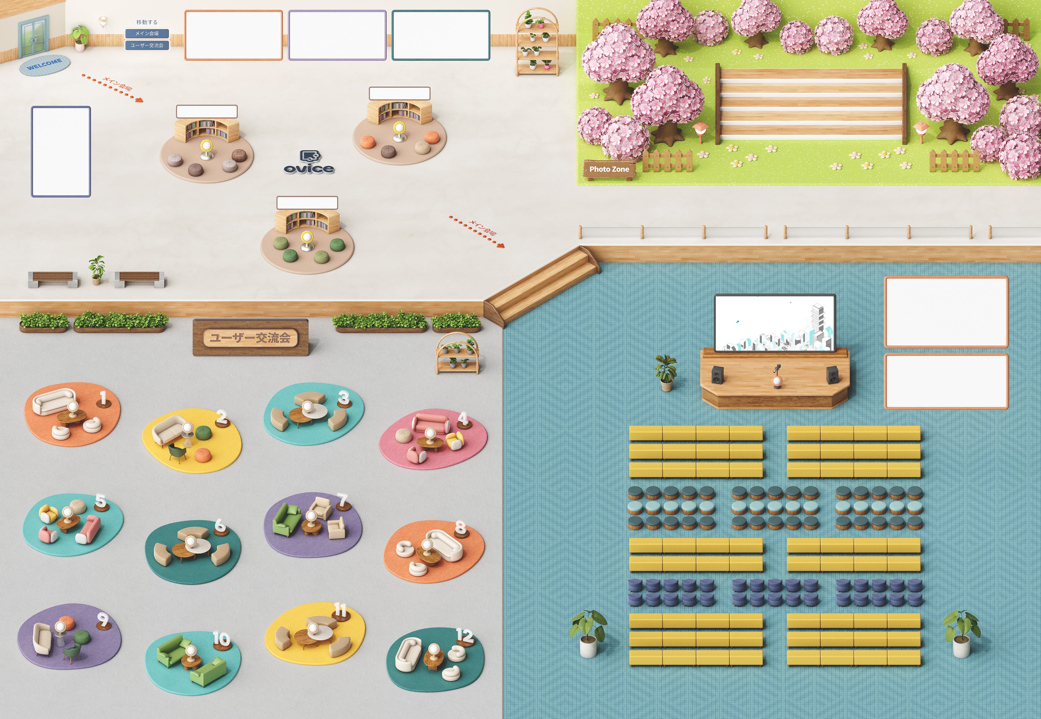 記念撮影用のレイアウトとして、oviceの「Basic」サイズ(最大接続人数50名)用の画像を公開しており、3月28日(火)頃に「Standard」サイズ(最大接続人数200名)のレイアウト画像も追加予定です。既に利用しているレイアウトの一部に、今回公開したお花見用レイアウトを組み合わせることもできるため、歓送迎会や卒業イベントなどの記念撮影にもピッタリです。