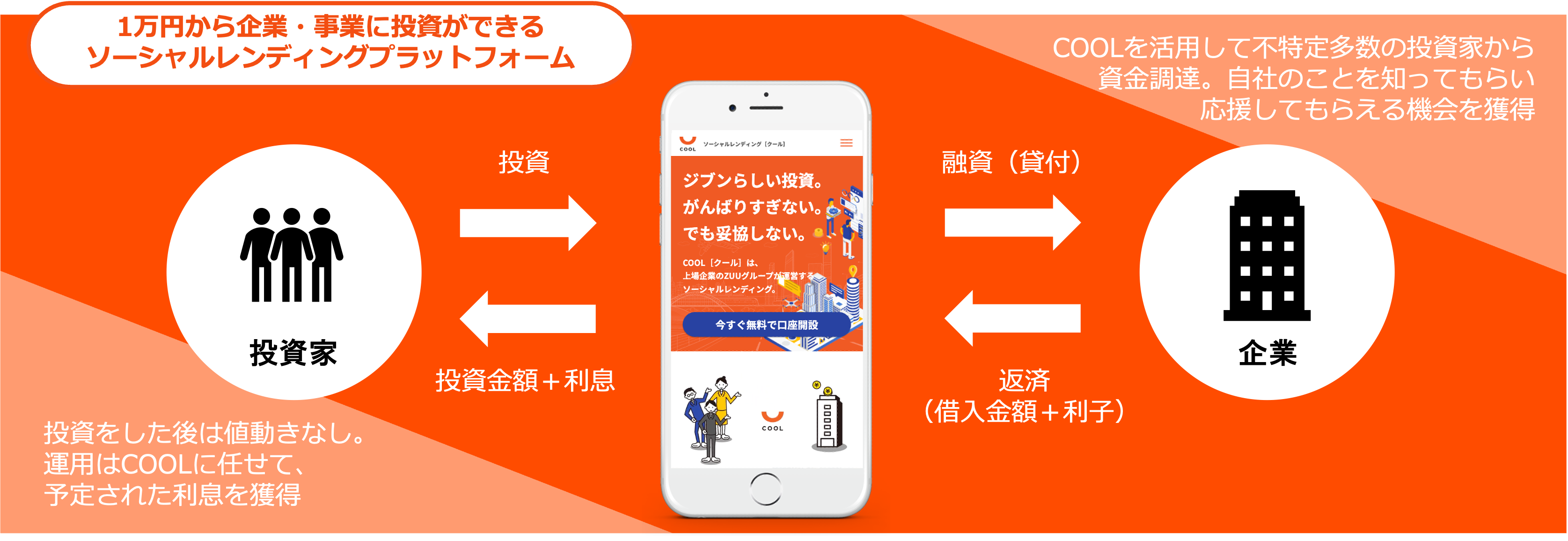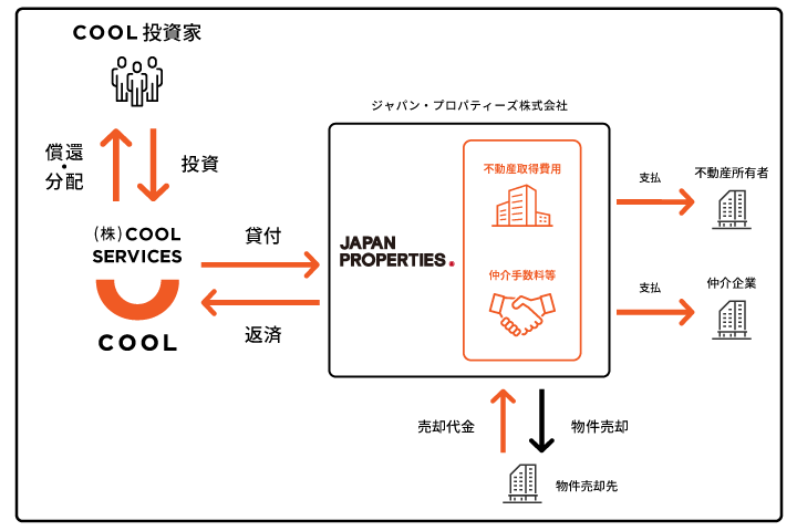 お客様より投資いただいた当ファンドの資金は、同じくZUUグループに属する貸金業者である株式会社COOL SERVICES(東京都世田谷区:代表取締役 伊藤 謙)からジャパン・プロパティーズに対して貸し付けられ、ジャパン・プロパティーズが展開する不動産再生事業に係る資金として使用されます。