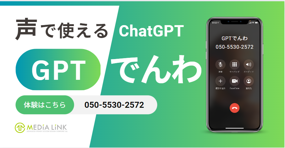 電話をDX化する「DXでんわ」を提供するメディアリンク株式会社(本社: 東京都港区、代表取締役:松本 淳志)は、OpenAI社が開発・提供する「ChatGPT」と電話で会話できるChatGPT「GPTでんわ」を開発し、本日より無料体験デモ番号(050-5530-2572)を公開いたします。