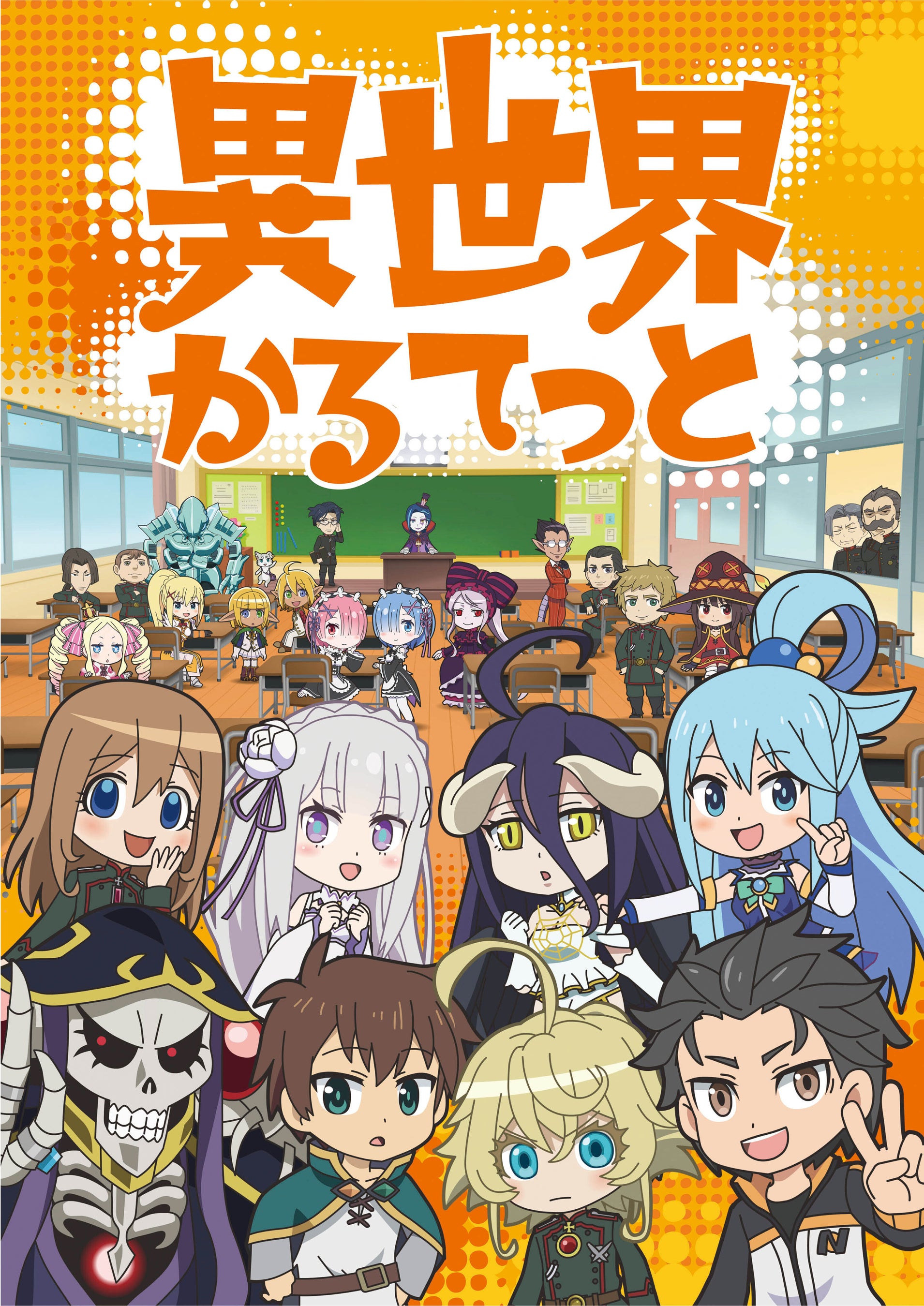 『異世界かるてっと』は、『オーバーロード』『この素晴らしい世界に祝福を!』『Re:ゼロから始める異世界生活』『幼女戦記』の4作品の登場人物がぷちキャラ化し、一堂に会するクロスオーバーTVアニメです。4つの世界に突如出現した「ボタン付きスイッチ」。ボタンを押してしまったそれぞれの世界のキャラクターたちは、現代の学園と思われる場所へと飛ばされます。同じような状況で集まった「4つの異世界の転移者」たちが「学園生活」を送ることになるというストーリーが多くのファンに楽しまれています。