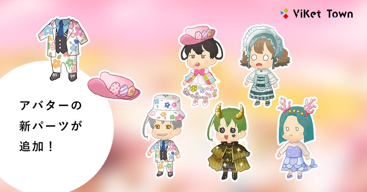 「ViKet Town(ビケットタウン)」では自分となって働くアバターが存在します。アバターには、頭、髪、目、口、服装、数種類の初期パーツから選択する事ができ、理想とする自分を生み出す事が可能です。 アバターを通してのコミュニケーションは、年齢、国籍、性別、見た目、生まれ持ったルーツによる様々な偏見をなくし、 純粋な気持ちで仲間とのプロジェクトの成功を目指す事ができます。 自分に自信がない人でも、働く新たな自分を生み出すことで、コミュニケーション能力の向上も期待でき、異空間で働くアバターは、様々なアイテムを身に着け、仲間とのコミュニケーションのきっかけともなります。今回は、イースターを意識した着るだけでハッピーになれるカラフルで華やかな衣装が登場。お花柄の衣装もとても可愛らしく、色とりどりなお菓子の世界との相性が抜群です。