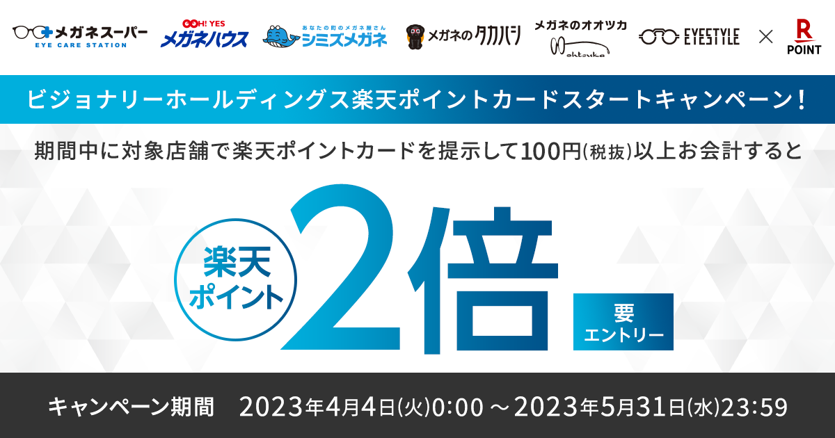 本サービス開始を記念して、2023年4月4日(火)から5月31日(水)まで、「ビジョナリーホールディングスサービス開始記念!楽天ポイントカードスタートキャンペーン」を実施します。キャンペーン期間中にエントリーのうえ、対象店舗で「楽天ポイントカード」もしくは「楽天ポイントカード」機能が搭載されたアプリを提示して100円(税抜)以上の会計をすると、「楽天ポイント」を通常の2倍進呈します。