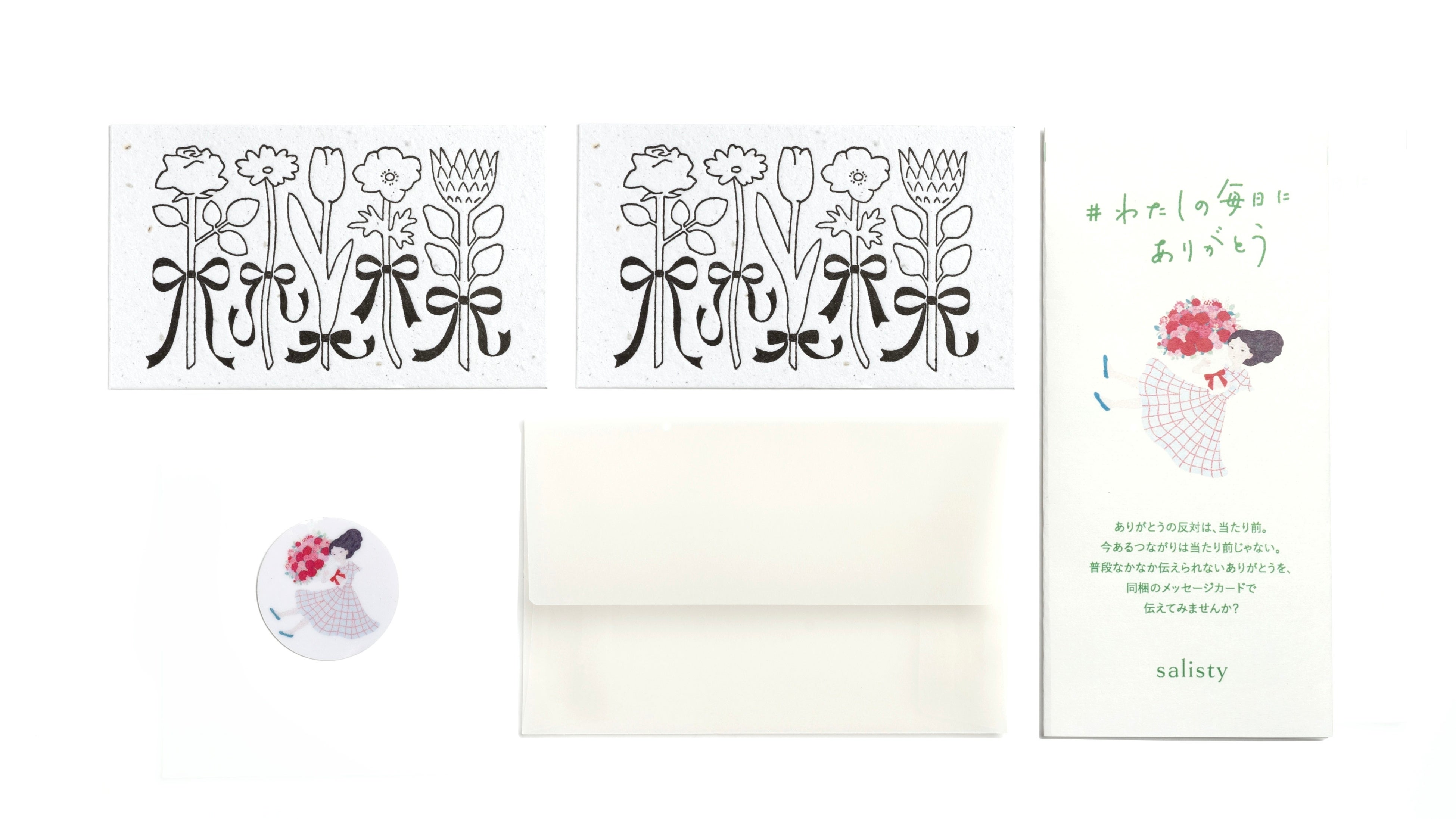 今回のノベルティは、イラストレーターのせいのちさとさんコラボデザイン。色鉛筆の優しいタッチで、ほっこりした雰囲気に仕上がりました。カモミールの種が入ったsalistyオリジナルシードペーパーです。