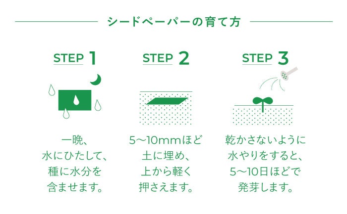※シードペーパーには良質の種子を使用しておりますが、種子の性質上100%の発芽を保証するものではありません。種まき時期は20℃前後の気温となる春と秋で、発芽や生育は、環境や条件により異なります。