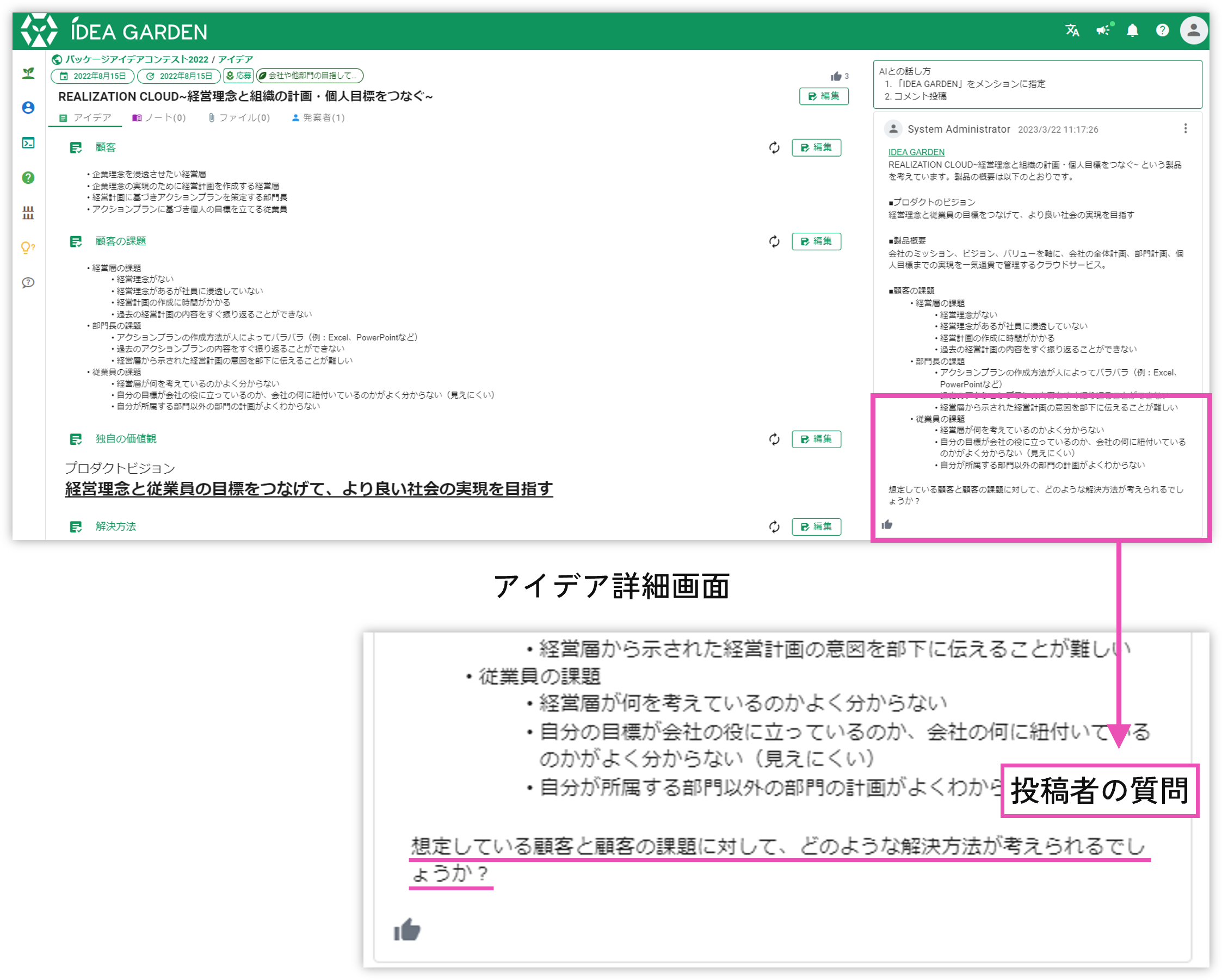 IDEA GARDENに登録されたアイデア詳細画面のコメント欄で「IDEA GARDEN」をメンションして質問を投稿すると、AIがアイデアの概要や過去のコメントを踏まえたうえで回答します。さらにAIの回答の内容に基づいてさらに質問を重ねることで議論を深めることもできます。