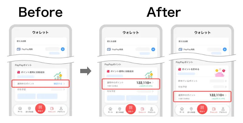 - PayPayアプリ下部の「ウォレット」でも「ポイント運用」の状況が確認できるようになりました!