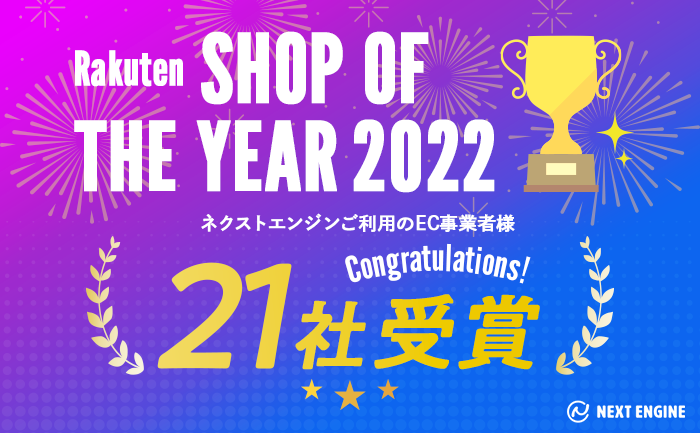 今回「楽天市場ショップ・オブ・ザ・イヤー2022」を受賞した「ネクストエンジン」ご利用のEC事業者様は合計21社で、うち7社が初受賞となりました。