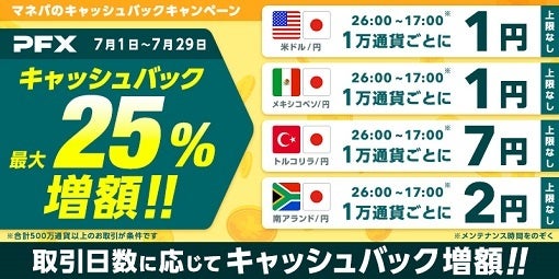 株式会社 マネーパートナーズ(代表取締役社長:福島秀治、本社:東京都港区、以下「当社」)では、7月1日より『パートナーズFX』で、取引日数に応じて最大25%キャッシュバック増額の特典付きキャッシュバック キャンペーンを実施いたします。対象は、パートナーズFX「米ドル/円」・「メキシコペソ/円」・「トルコリラ/円」・「南アランド/円」です。