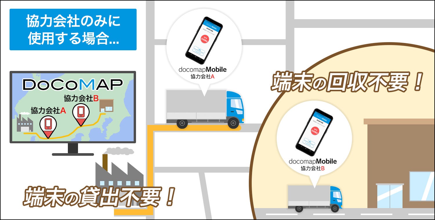従来までは、docomap端末※2などを搭載した車両の位置情報をDoCoMAP上で管理することが可能でしたが、利用者より「自社だけでなく協力会社の車両位置もDoCoMAP上で簡単に管理したい。」「日々入れ替わる協力会社の車両位置を管理したいが、専用端末の貸出や回収する手間と管理が大変でなかなか運用まで至らない。」などの課題をいただいておりました。