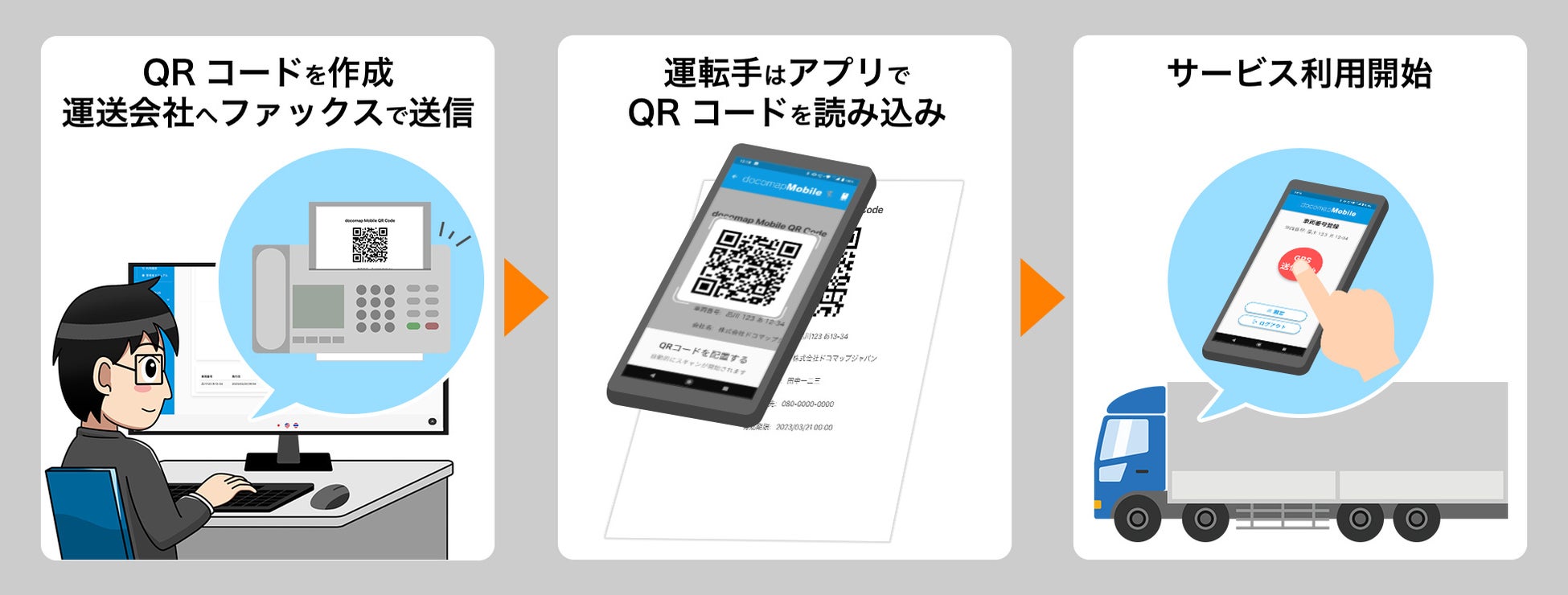 利用方法は、設定したログイン情報の入力、もしくは発行したQRコードをアプリケーションで読み込むだけで、特定の時間だけ自動で位置情報が発信されます。運行管理者は、DoCoMAP上でdocomap端末を搭載した自社車両とスマートフォンから発信される協力会社の車両位置を同時に確認することが可能なほか、従来のDoCoMAP標準機能を活用してリアルタイム渋滞情報や雨雲レーダー、過去の走行履歴なども利用できます。