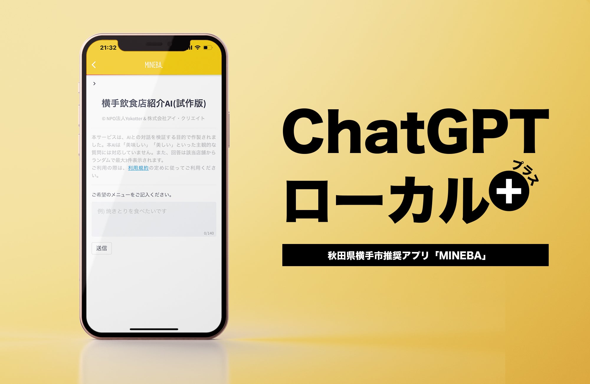 ホーム画面の「グルメ検索」をタップ、グルメ検索内の「横手飲食店紹介AIを試す」より利用可能です。