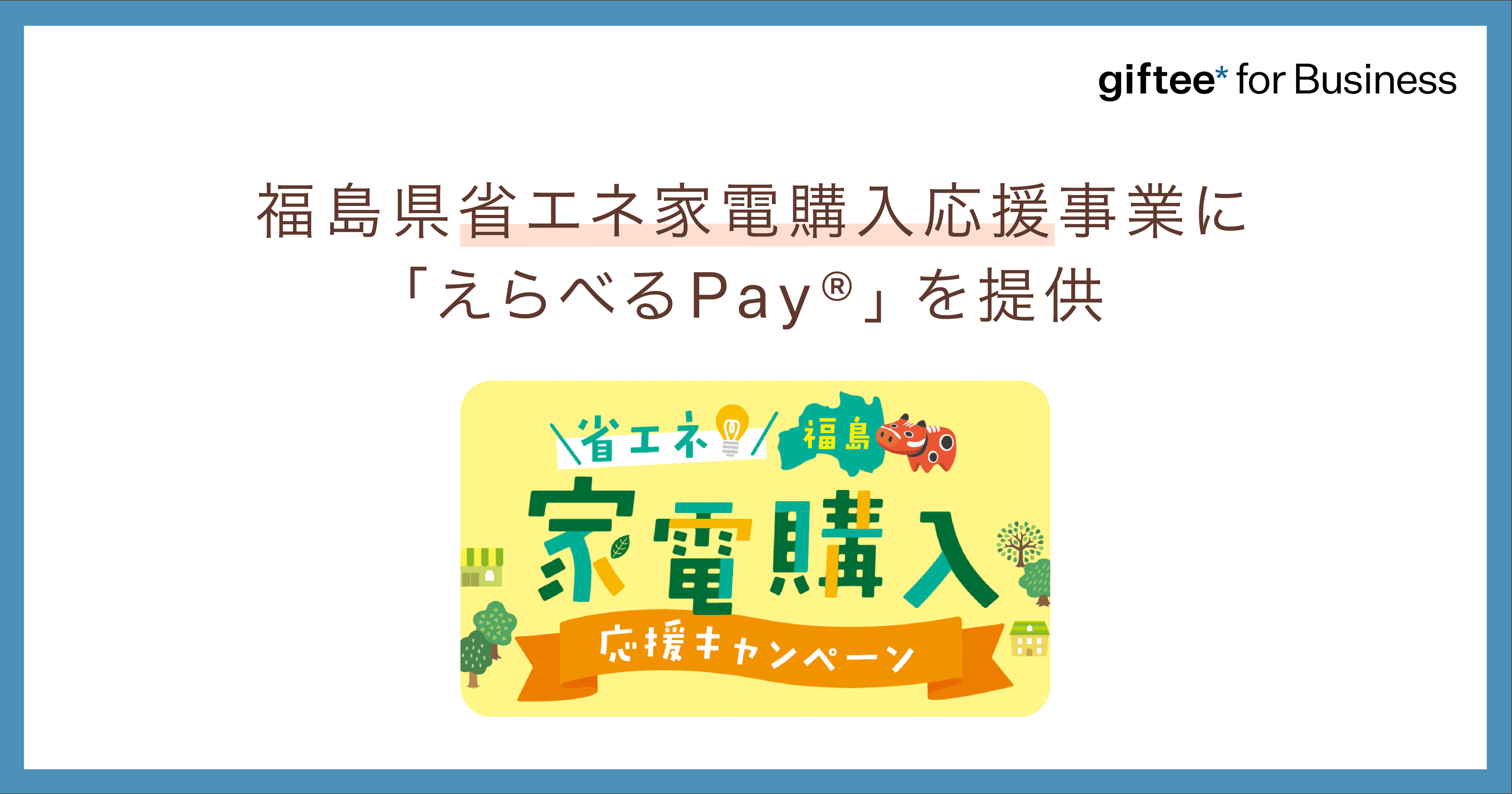 eギフトプラットフォーム事業(※1)を展開する株式会社ギフティ(本社:東京都品川区/代表取締役:太田 睦、鈴木 達哉/以下、ギフティ)は、デジタルギフトを活用した法人向けサービス「giftee for Business」(※2)を、福島県が行う「福島県省エネ家電購入応援事業」(以下、本事業)に採択いただきましたので、お知らせいたします。これに伴い、福島県が実施する「福島省エネ家電購入応援キャンペーン」(購入対象期間:2023年2月27日(月)〜)において、ギフティがキャンペーン事務局として運営統括を受託し、キャンペーンのインセンティブとして「giftee for Business」の主力プロダクトであるデジタルギフト「えらべるPay®」(※3)を提供しております。