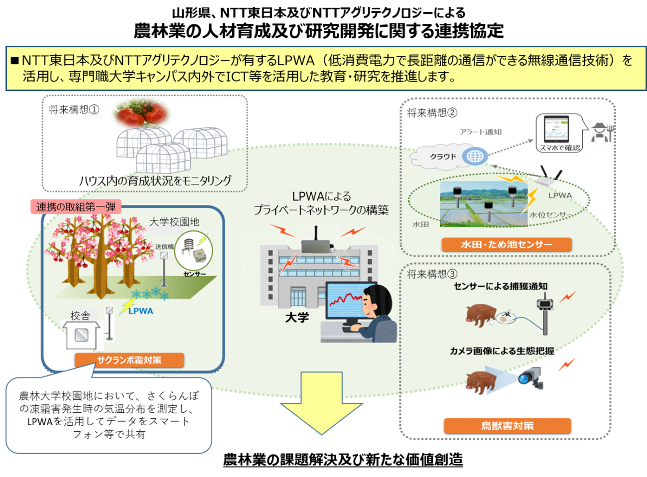 農林業分野において、デジタル技術を活用した生産性向上や新たな価値の創出が課題となる中で、三者が連携して、東北農林専門職大学(仮称)において、LPWA*を活用した農林業の人材育成・研究開発に取り組むこととしたものです。