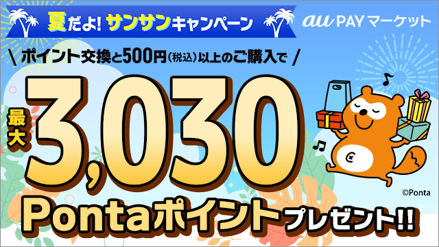 2022年7月1日にスタートする『最大3,030Pontaポイント当たる!夏だよ!サンサン★キャンペーン』は、『お得なポイント交換所』にて100ポイント以上の交換および実施期間中にau PAY マーケットで1回のお会計で500円(税込)以上のお買い物をされた方を対象に、3,030ポイントを100名に、100ポイントを10,000名にプレゼントするキャンペーンです。本キャンペーンでは、「auスマートパスプレミアム」会員、また、会員以外の方でも『お得なポイント交換所』で初めてポイント交換される方は、通常抽選参加1口のところ、2口の参加が可能となります。