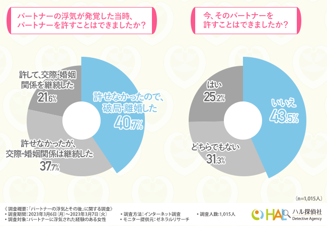 そこで今回、浮気・不倫調査や結婚信用調査、素行調査などを行うHAL探偵事務所(https://hal-tanteisya.com)は、パートナーに浮気された経験のある女性を対象に「パートナーの浮気とその後」に関する調査を実施しました。