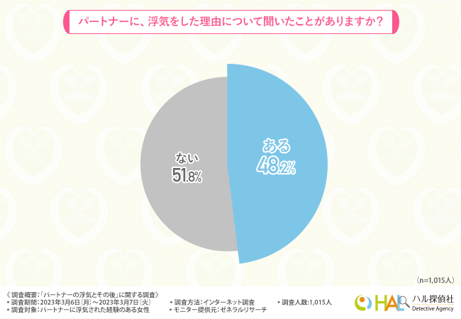 続いて「パートナーに、浮気をした理由について聞いたことがありますか?」と質問したところ、半数近い方が『ある(48.2%)』と回答しました。