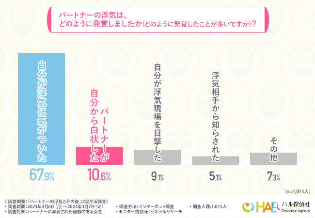 「パートナーの浮気は、どのように発覚しましたか(どのように発覚したことが多いですか)?」と質問したところ、『自分が浮気に気がついた(67.9%)』と回答した方が最も多く、次いで『パートナーが自分から白状した(10.6%)』『自分が浮気現場を目撃した(9.1%)』『浮気相手から知らされた(5.1%)』と続きました。