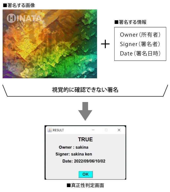 次の画像は提案技術による署名例です。署名する情報は所有者や署名者、署名日時や作品タイトルなど様々です。真正性判定画面で検証結果を示しています。署名情報は視覚的に確認できません。署名情報とECDSA署名はRS符号を介して画像に埋め込まれています(不可逆的埋め込み)。また、デジタル署名はRS符号に埋め込まれています。