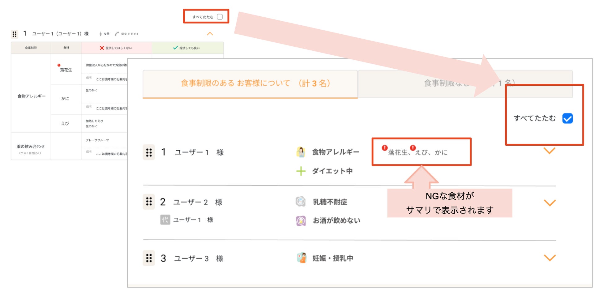 ゲストごとに提供できない食品の名称のみを表示できる「アレルギーサマリ機能」を追加しました。食事制限一覧上部の「すべてたたむ」を押下するとご利用いただけます。