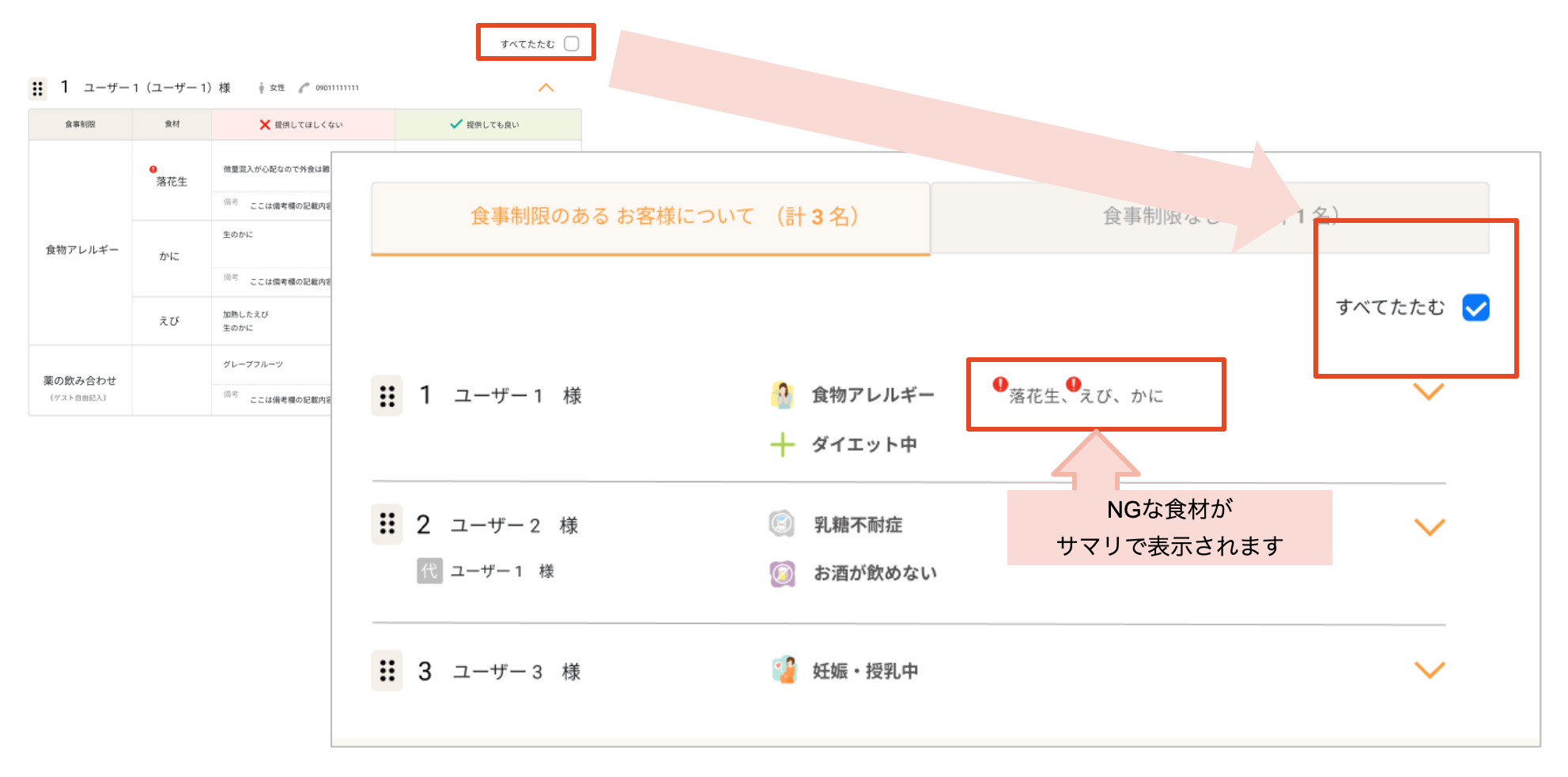 ゲストごとに提供できない食品の名称のみを表示できる「アレルギーサマリ機能」を追加しました。食事制限一覧上部の「すべてたたむ」を押下するとご利用いただけます。