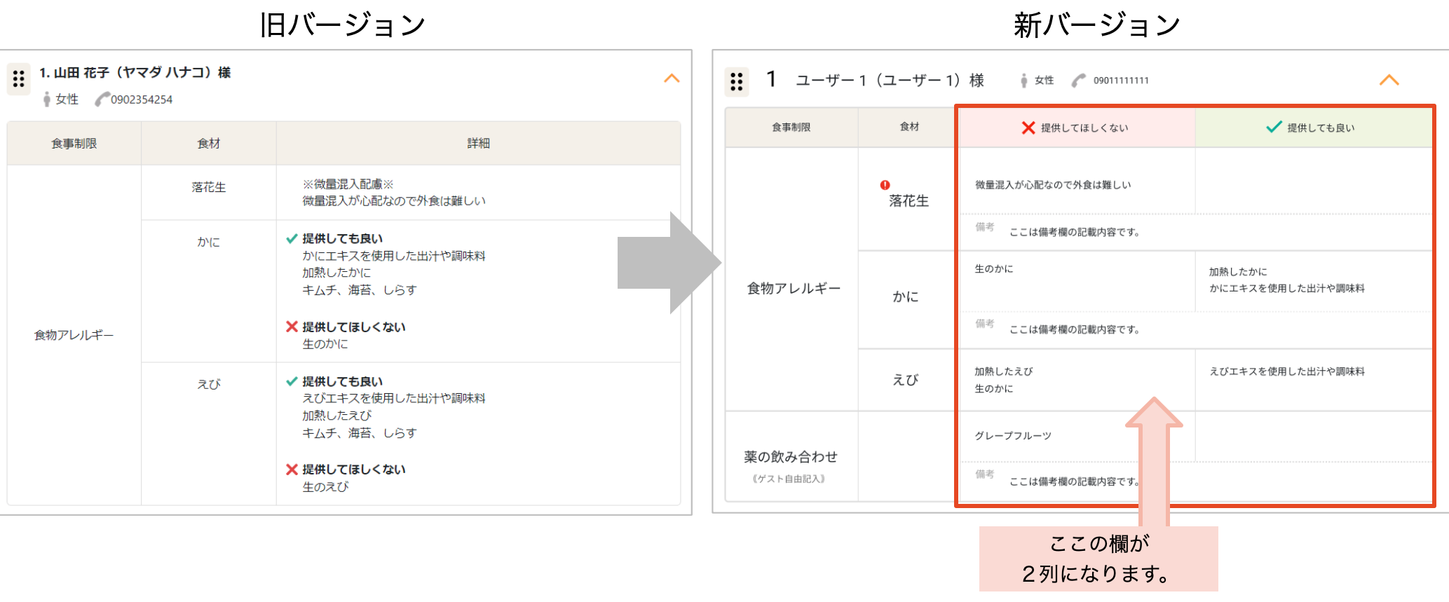 ゲストからヒアリングした情報をもとに作成される食事制限一覧において、「詳細」と記載していた欄を「提供してほしくない」「提供してもよい」の2列に分け、視認性を高めました。
