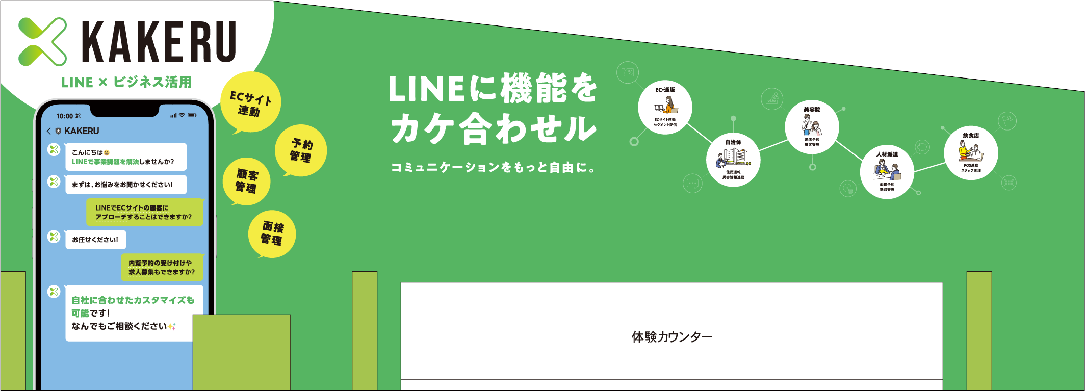 展示ブースでは、LINE公式アカウント機能拡張サービス「KAKERU(カケル)」の各種機能を実装した実際の操作画面をご覧頂く予定です。