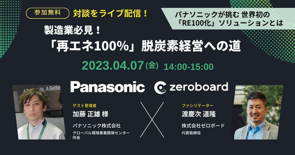 GHG(温室効果ガス)排出量算定・開示・削減を支援するソリューション「zeroboard」を提供する株式会社ゼロボード(東京都港区、代表取締役:渡慶次 道隆、以下「当社」)は、パナソニック株式会社 グローバル環境事業開発センター所長の加藤 正雄氏をゲストにお招きし、2023年4月7日(金)14:00より、当社代表 渡慶次との対面での対談ウェビナー「『再エネ100%』脱炭素経営への道 ~パナソニックが挑む世界初の『RE100化』ソリューションとは~」を、ライブ配信することをお知らせします。皆さまの参加をお待ちしております。