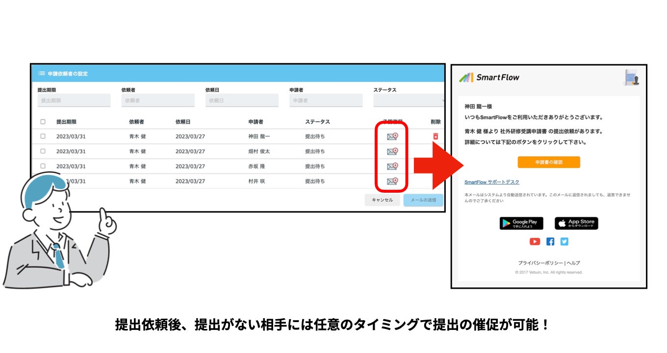 進捗管理を行い、未提出のユーザーや至急提出が必要なユーザーに対して、SmartFlowから催促通知が送信可能です。