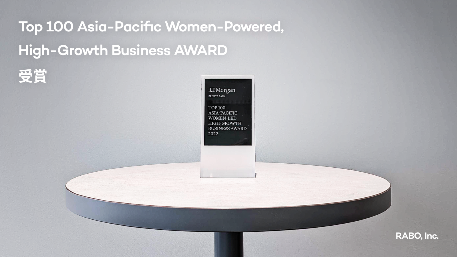 TOKYO, March 28th, 2023 – RABO Inc. (Headquarters: Shibuya-ku, Tokyo; CEO: Yukiko Iyo) is proud to announce that we have been selected as a recipient of the prestigious “Top 100 Asia-Pacific Women-Powered, High-Growth Businesses” by J.P. Morgan Private Bank. The award recognizes RABO’s outstanding performance, leadership, and commitment to driving growth and innovation in the region as a representative from Japan.