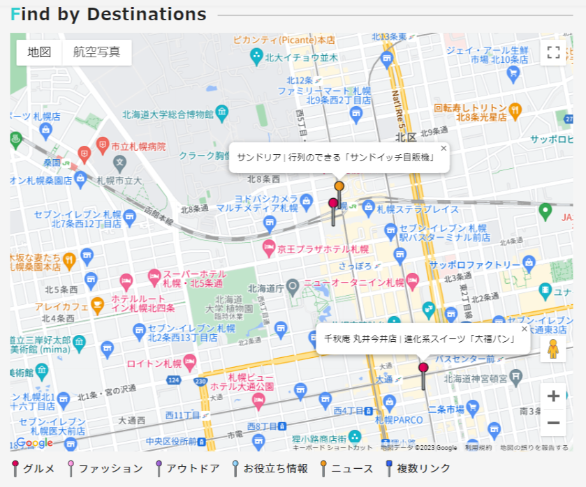 現在地から行けるスポットを視覚的・直観的に探すことできる機能を追加しました。“旅ナカ”(旅行中)で使用していただくために、紹介しているスポットをマッピングし、ビジュアル化しました。記事を見てから、訪問へのアクションを容易にしました。
