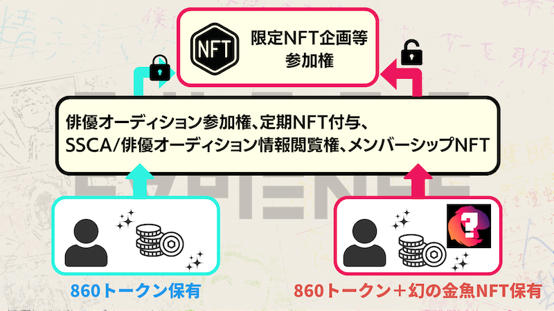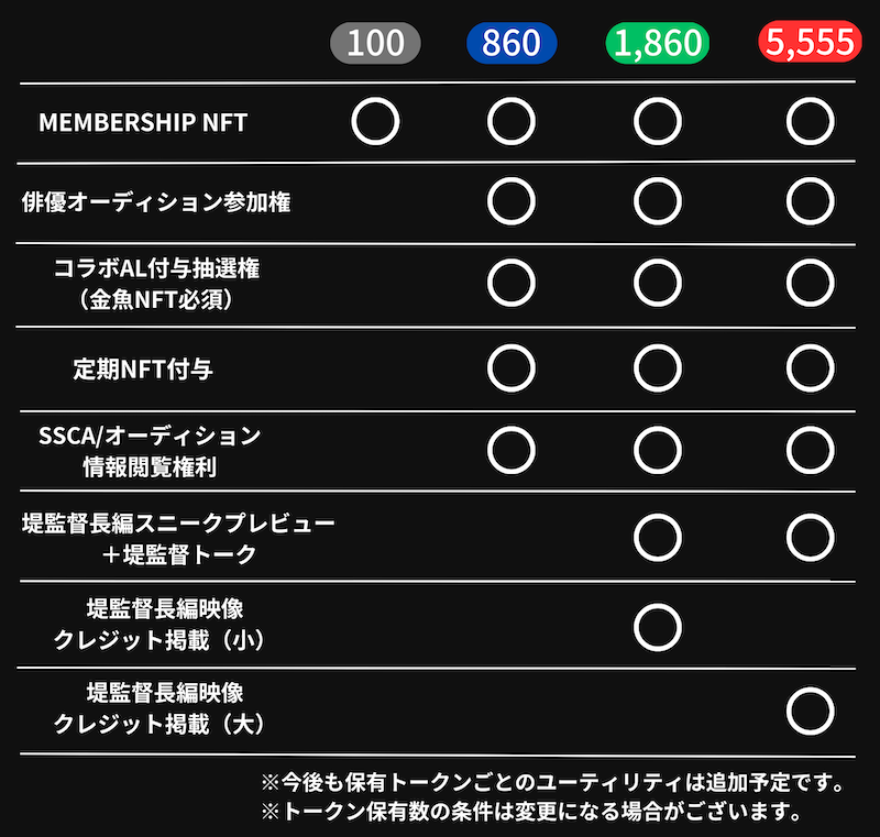 これまでは860トークン以上を保有している方を対象に、俳優オーディションや定期的な記念NFT付与、クリエイターの発掘や育成を目的にする「SUPER SAPIENSS CREATORS ACADEMY(SSCA)」の特別受講権などを保有特典として提示して参りました。
