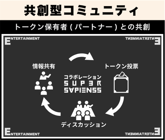 私たちは、このSUPER SAPIENSSが日本のエンタメ新時代を切り開くために、FiNANCiEの『トークン発行』と、トークンを基盤とした『共創コミュニティ』を活用した【エンタメDAO】にチャレンジしています。