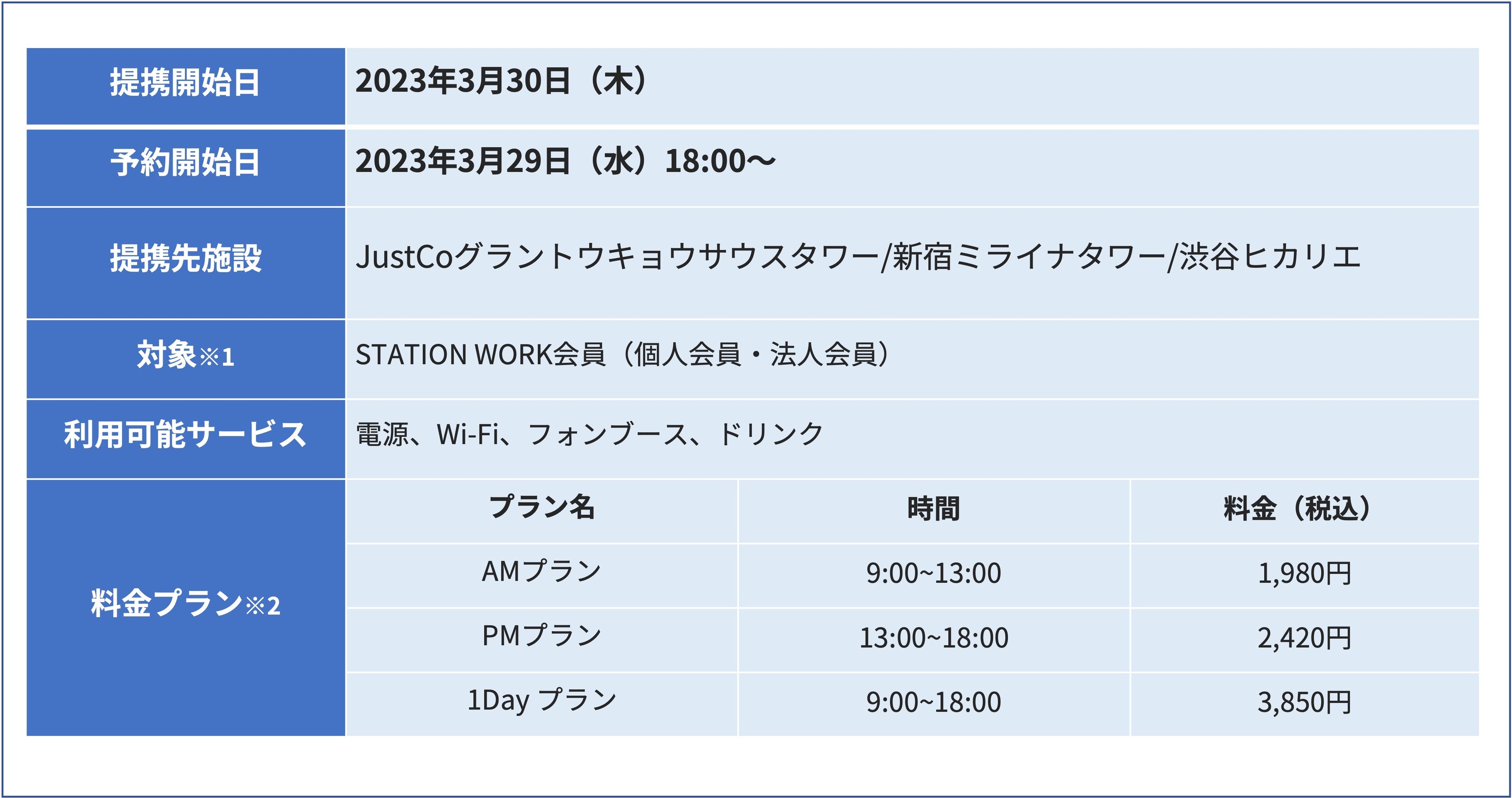 この提携により、STATION WORK会員は、JustCoが運営するJustCoグラントウキョウサウスタワー11階(東京駅)、JustCo新宿ミライナタワー18階(新宿駅)、そしてJustCo渋谷ヒカリエ33階(渋谷駅)を半日1,980円(税込)から利用可能となります。