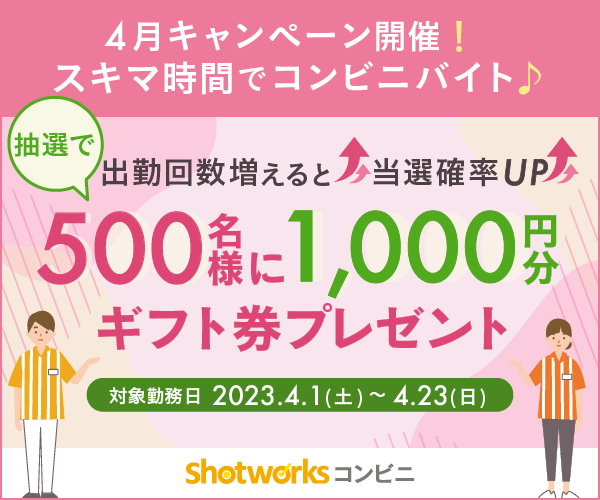 『ショットワークスコンビニ』から、キャンペーン期間中のバイトに応募し、1回以上「出勤」された方の中から、