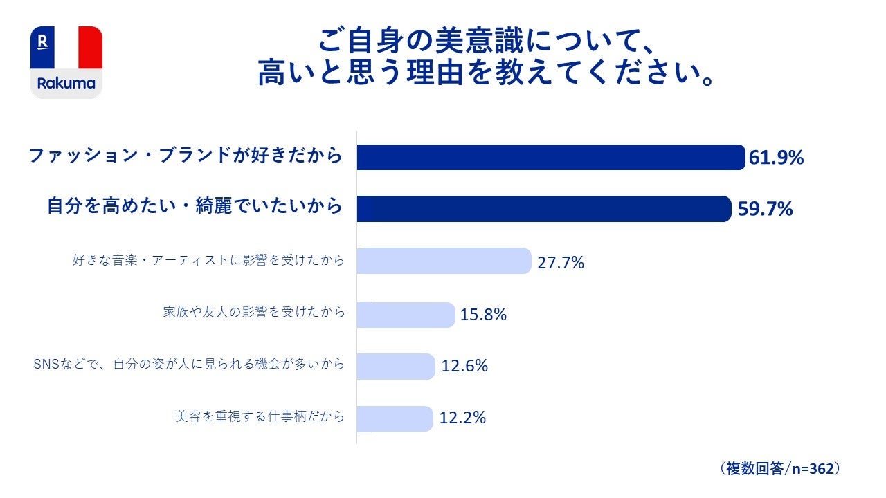自分の美意識が「高い」、「やや高い」と答えた278人に「その理由」について質問したところ、「ファッション・ブランドが好きだから」(61.9%)が最多、次いで「自分を高めたい、綺麗でいたいから」(59.7%)、「好きな音楽・アーティストに影響を受けたから」(27.7%)、「家族や友人の影響を受けたから」(15.8%)、「SNSなどで、自分の姿が人に見られる機会が多いから」(12.6%)、「美容を重視する仕事柄だから」(12.2%)という結果でした。