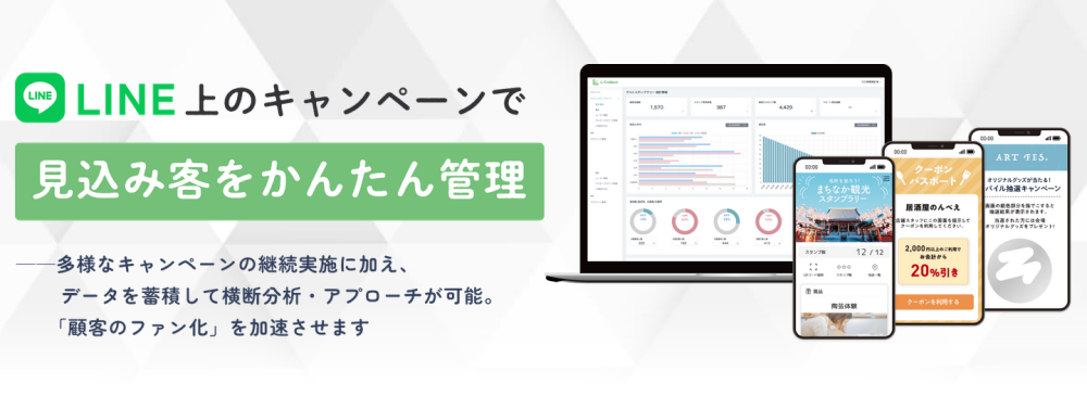 『L-Collect』は、LINEを通してスタンプラリーやクーポン抽選キャンペーンなどの多様なキャンペーンを実施でき、収集したデータを管理・アプローチできるサービスです。