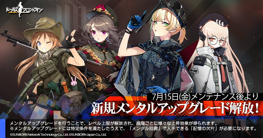 「7月15日(金)メンテナンス後」より、人形の秘めた力を引き出し、レベル上限の引き上げ・スキルの追加・専用装備の獲得など大きな変化が起こる「メンタルアップグレード」が可能になる対象に、新たに4名のキャラクターが追加されます。