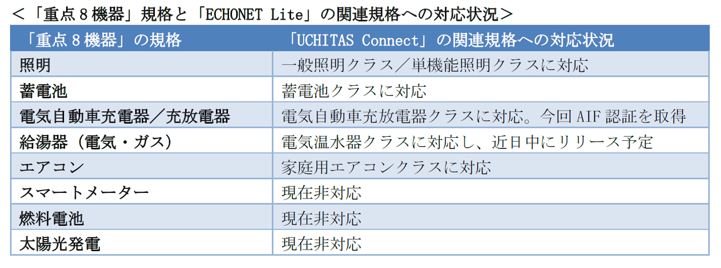 「UCHITAS」、「UCHITAS Connect」では、「ECHONET Lite」規格が定める「重点8機器」の規格への対応を進めています。政府の定める「重点8機器」と、それぞれの「ECHONET Lite」の関連規格への「UCHITAS Connect」の対応状況は以下の通りです。