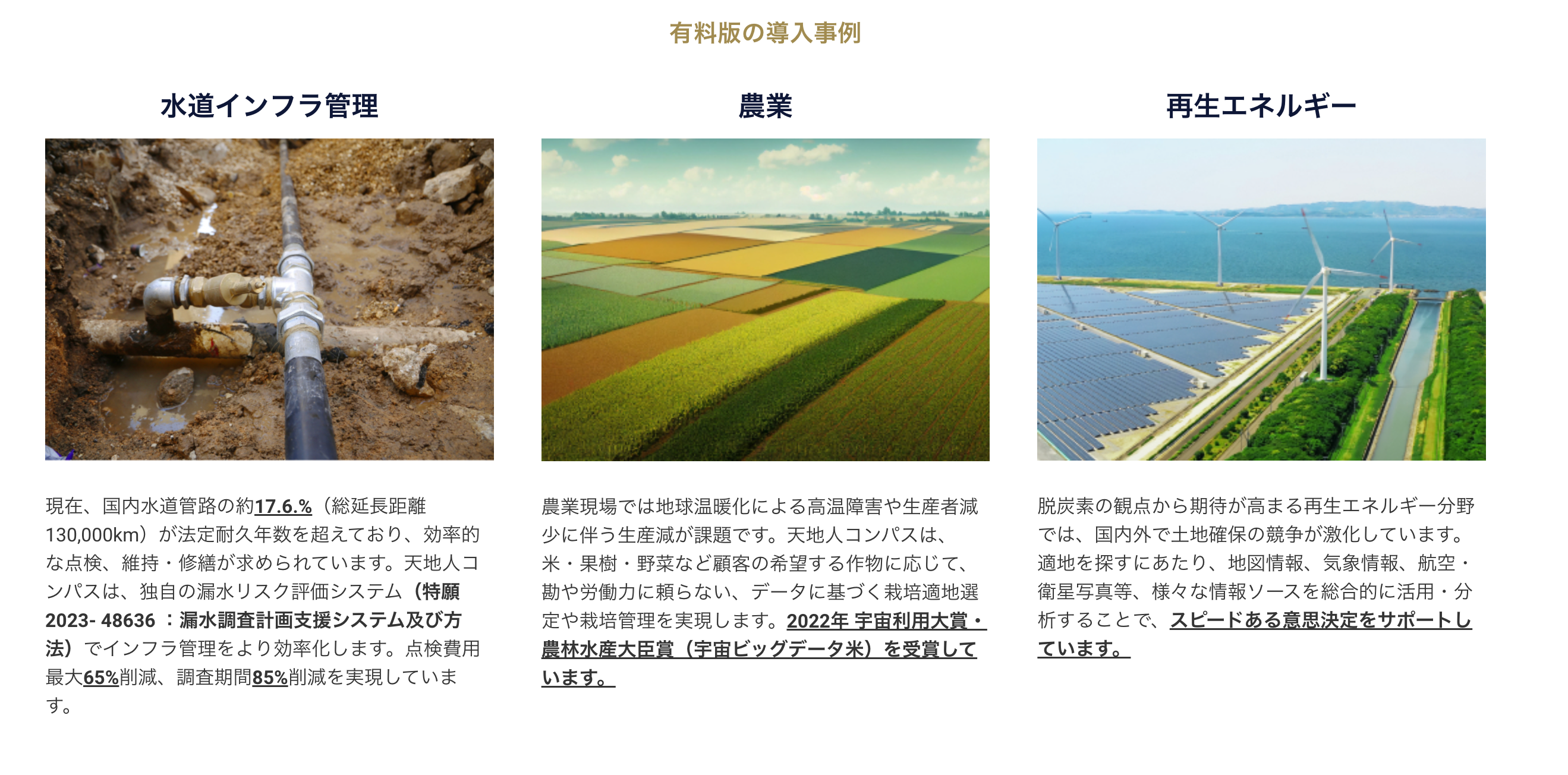 さらに、JAXA認定ベンチャーならではの優れた衛星データコンシェルジュがビジネスをサポートするため、専門知識がなくても活用いただけます。過去には、水道インフラ管理・農業・再生エネルギーの分野でご活用いただいた実績がございます。