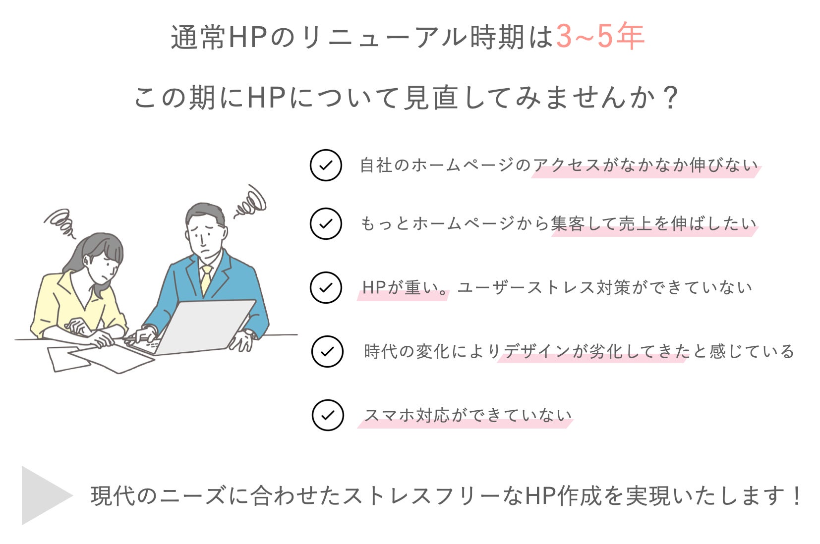 今のHP / LPの運用、成果は出ていますか?何か疑問に感じることはありませんか?社内にエンジニアやデザイナーがいない…制作会社にサイトの分析や改善をお願いするには費用がかさむ…そんな悩みを持った方向けに既存のHP / LPを分析して改善提案、改修をおこなう新プランをはじめました。サイトの問題・課題やお悩みに、解決策をご提案させていただきます。