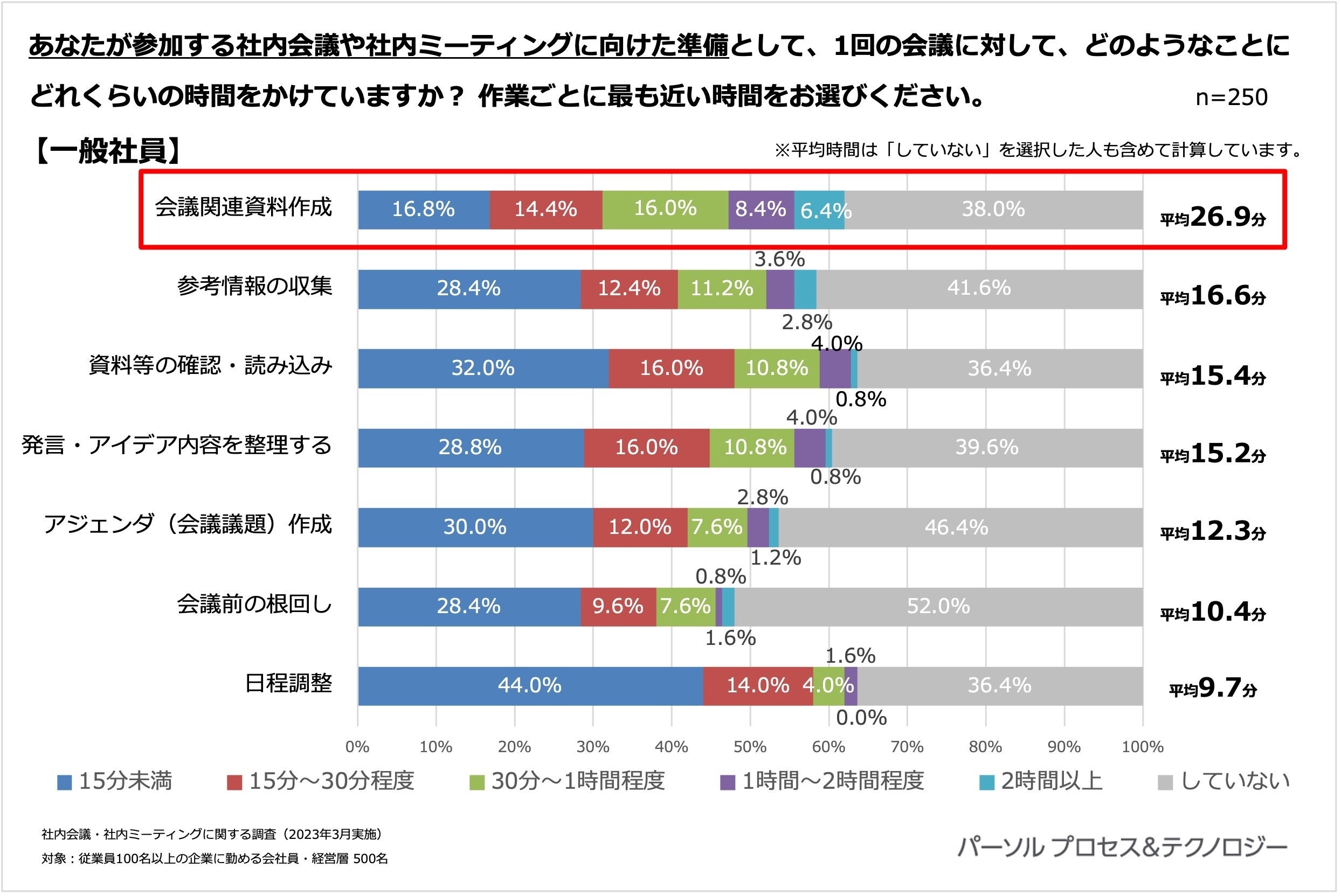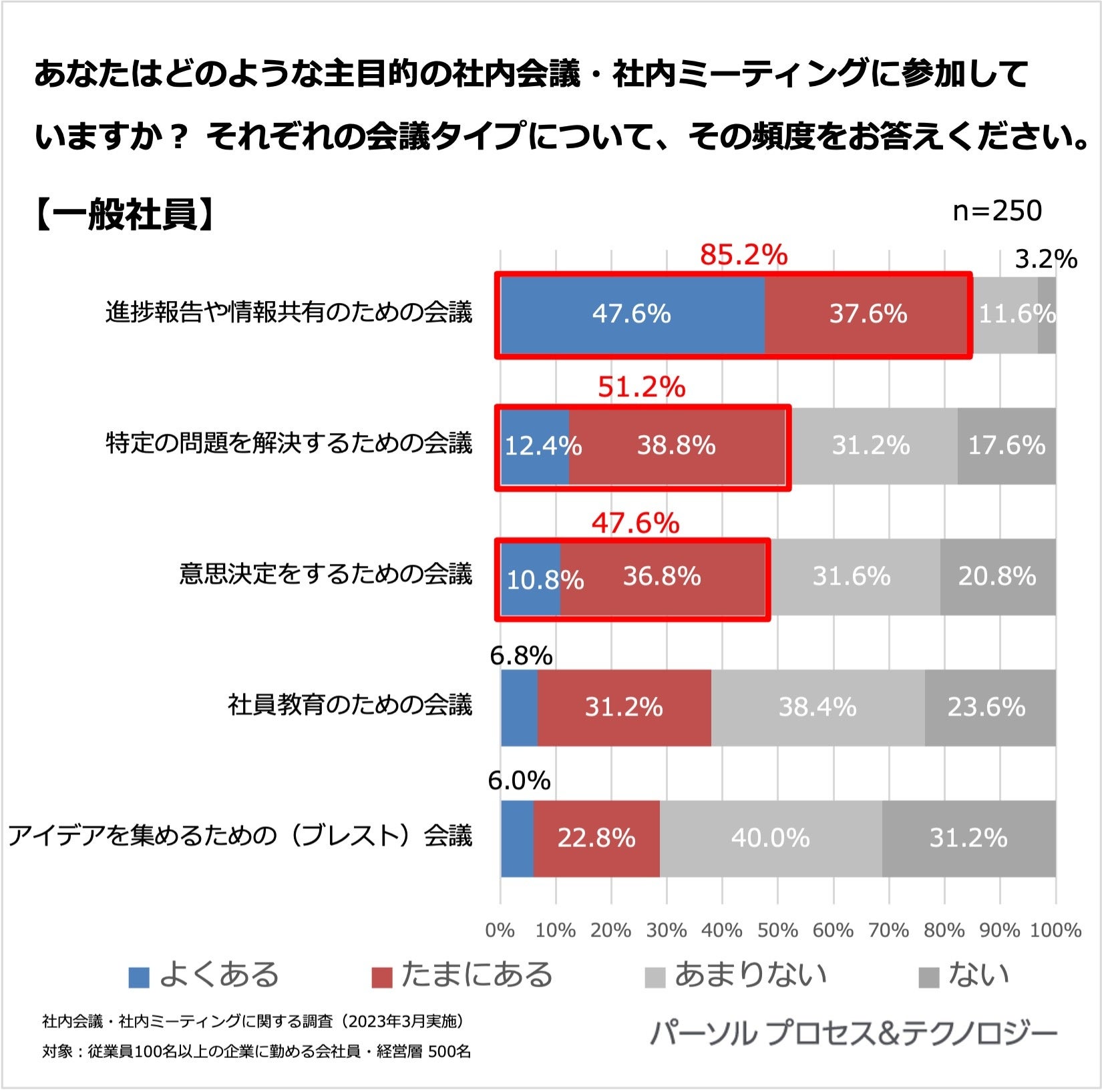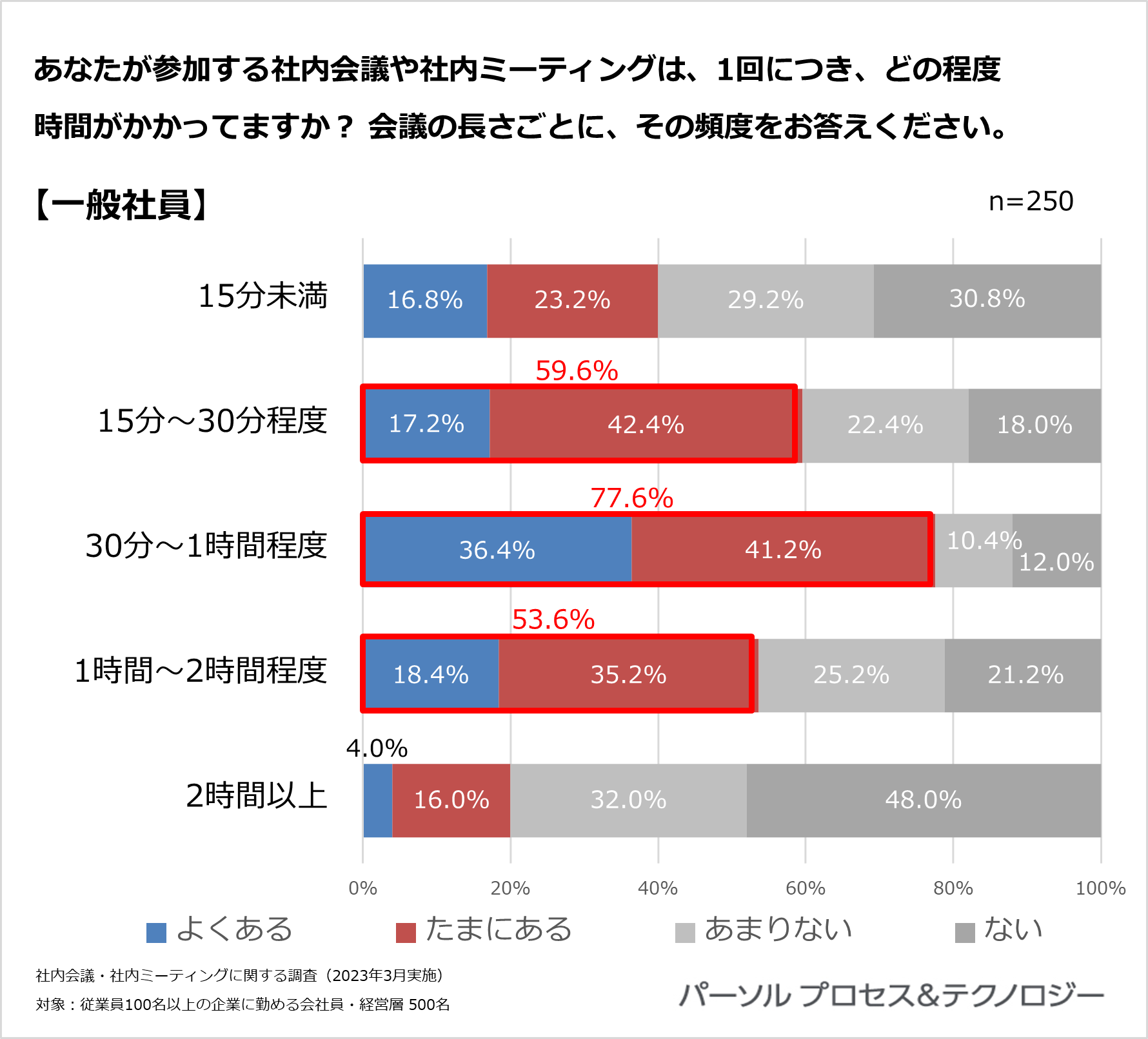 <社内会議や社内ミーティングに関する調査」概要> 調査機関:2023年3月13日(月)~3月17日(金) 調査方法:インターネット定量調査 調査対象: 全国の従業員100名以上の企業に勤める会社員・経営層 ※調査対象はいずれも20代~60代男女 ※本リリースの調査結果をご利用いただく際は【パーソルプロセス&テクノロジー調べ】とご明記ください。 |