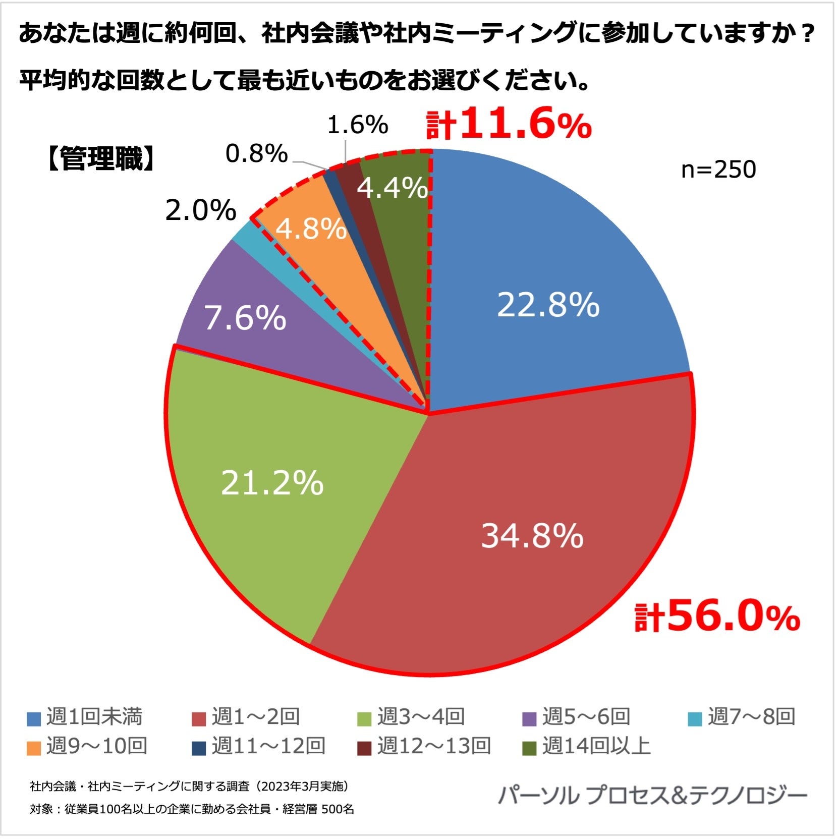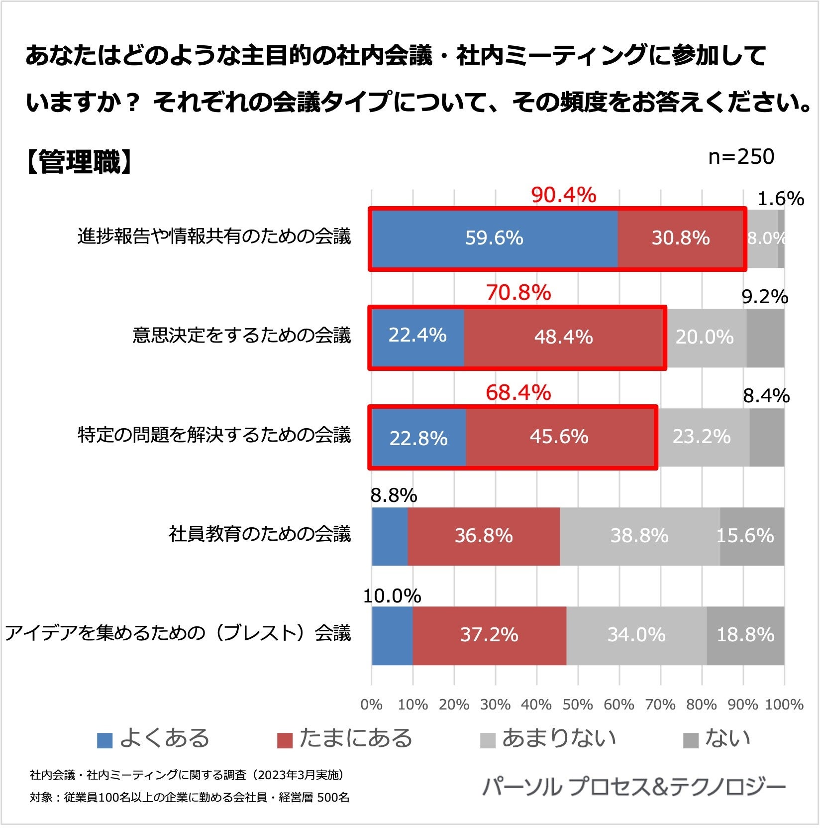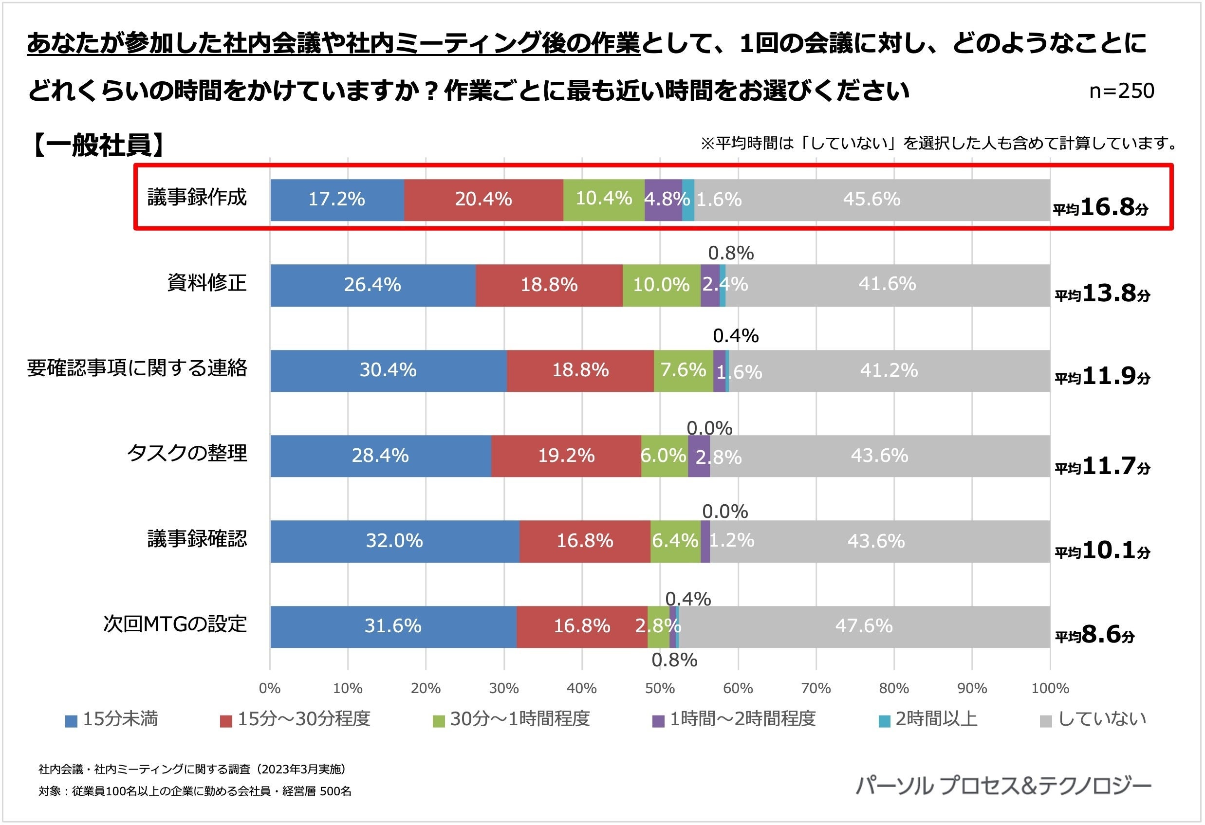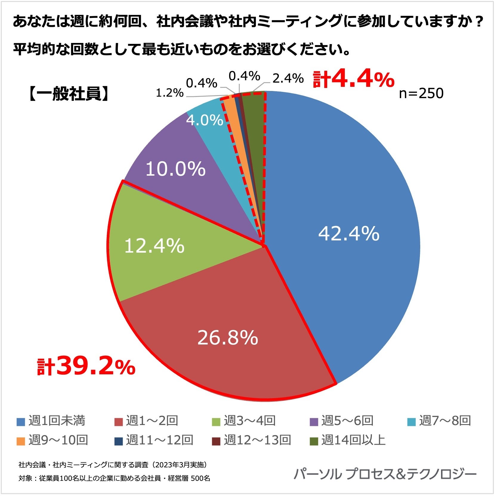 <社内会議や社内ミーティングに関する調査」概要> 調査機関:2023年3月13日(月)~3月17日(金) 調査方法:インターネット定量調査 調査対象: 全国の従業員100名以上の企業に勤める会社員・経営層 ※調査対象はいずれも20代~60代男女 ※本リリースの調査結果をご利用いただく際は【パーソルプロセス&テクノロジー調べ】とご明記ください。 |